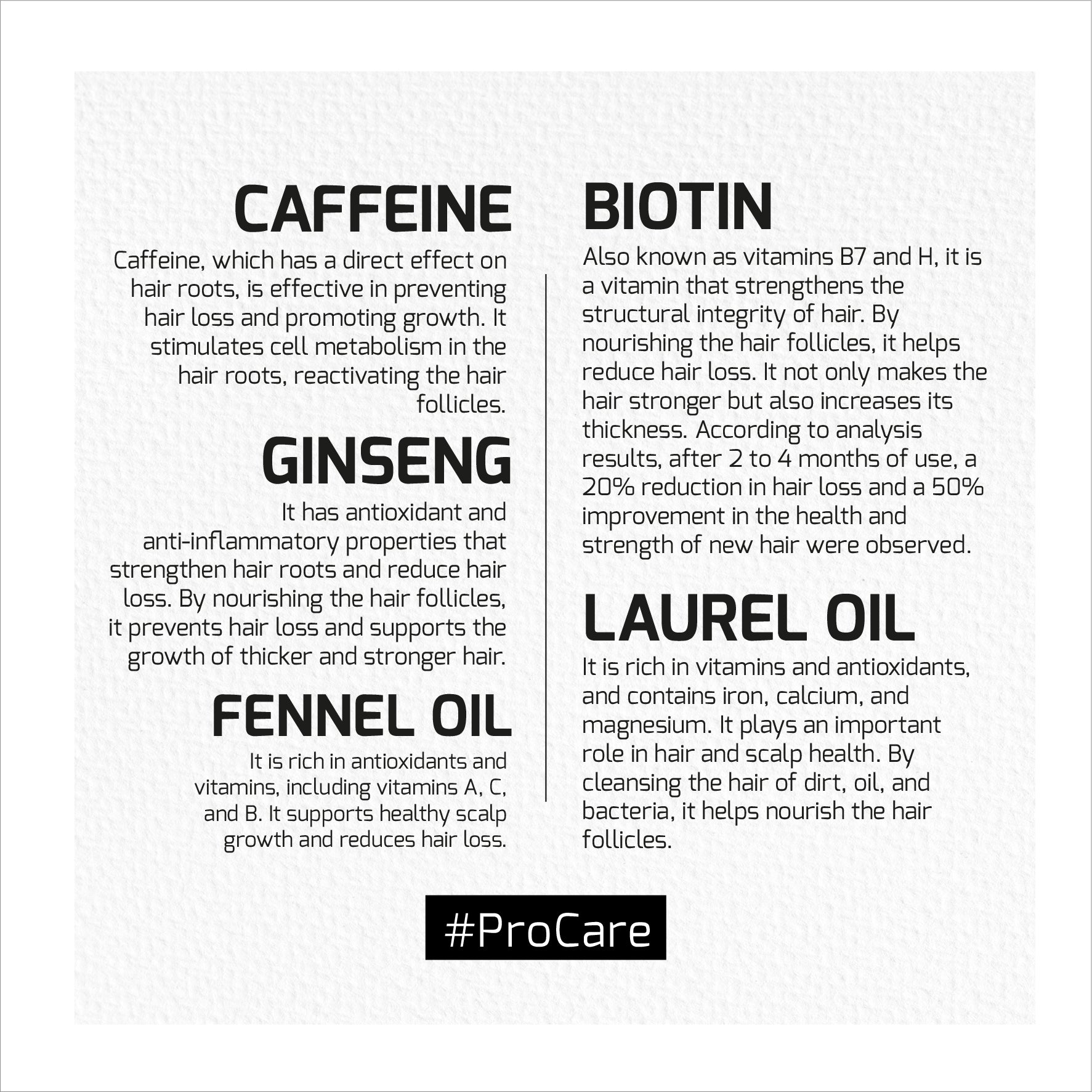 Es enthält eine Kräuterformel, die Haarausfall vorbeugt und gesundes Haarwachstum fördert. Das Caffeine Ginseng Pro Care Shampoo enthält eine Kräuterformel, die gesundes Haarwachstum fördert, indem es Haarausfall vorbeugt. Anwendung: Eine ausreichende Menge auf das nasse Haar sprühen, einmassieren und ausspülen.