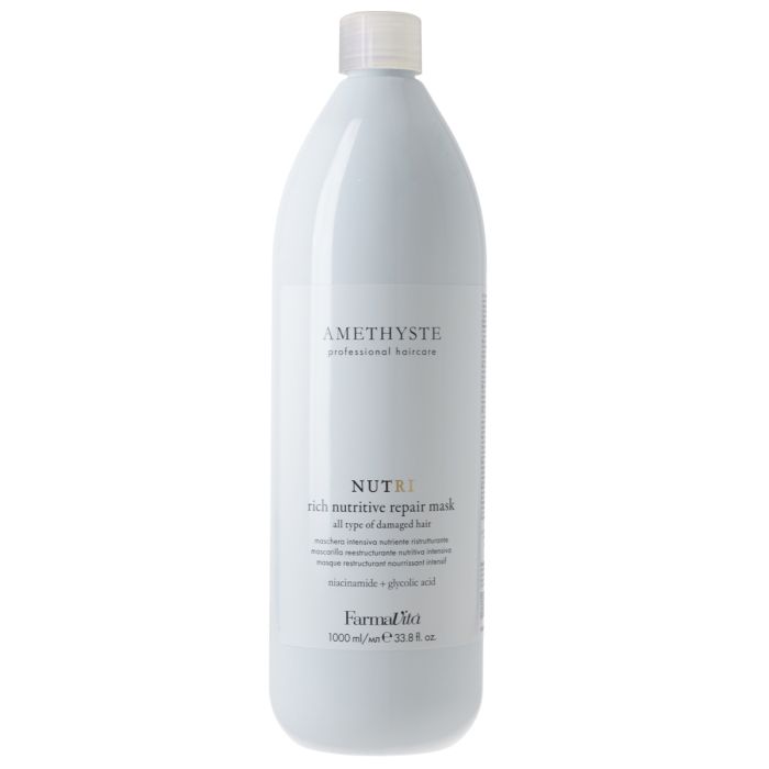 FarmaVita Amethyste Nutri Rich Nutritive Repair Mask 1000 ml ist eine pflegende und regenerierende Haarmaske für geschädigtes Haar. Die Haarmaske ist mit Niacinamid + Glykolsäure angereichert, um die Haarstruktur zu reparieren und zu stärken und das Haar wieder weich und glänzend zu machen. Mehr lesen
